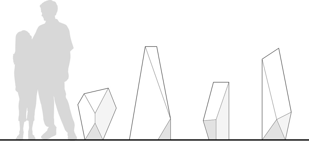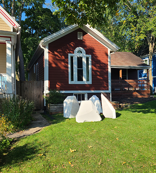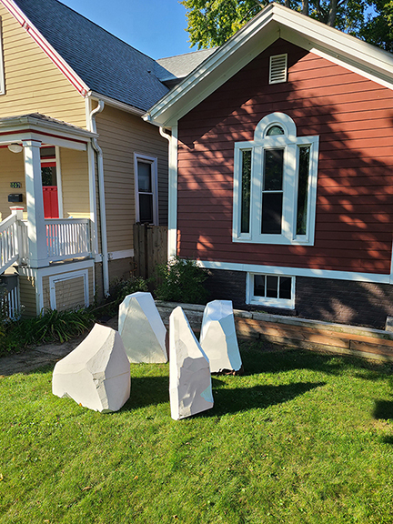 Adrift, 2023 This series of iceberg sculptures have washed up in a front yard. Perhaps these are remnants of the polar caps, having been deposited here by the rising sea. They stand as heralds, warning of a future in which action is not taken.