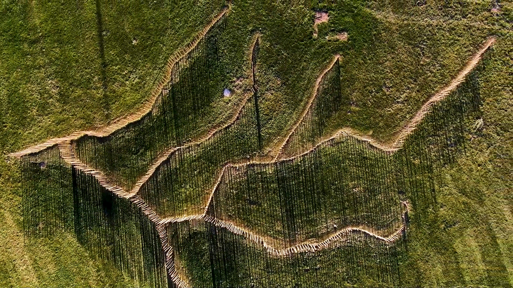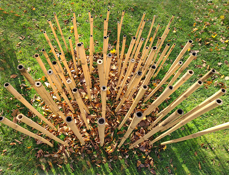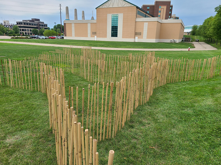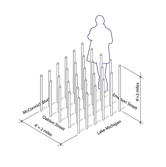 Glacier, 2021 This installation would depicts a slice of Evanston covered by the massive glacier that would eventually carve the Great Lakes, all at 1:2600 scale. This slice is delineated by a grid of bamboo stakes, laid out in a 4-foot cube.