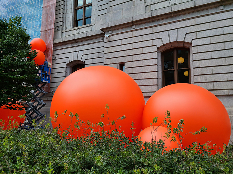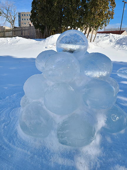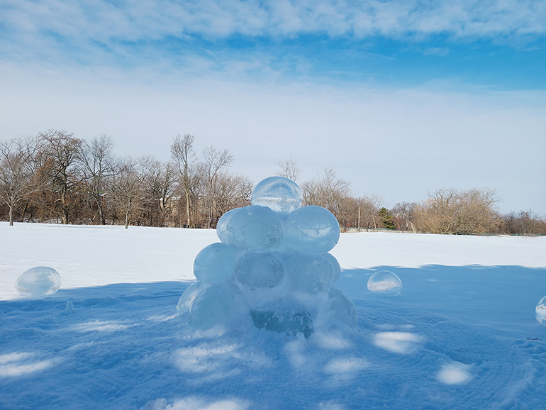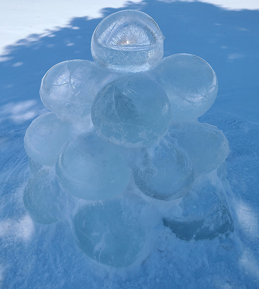Ice Cairn, 2022 Part of the Winter Wonderland outdoor show, this piece was composed of solid ice spheres, stacked into an ancient funerary cairn. This memory of winter lasted well into Spring.