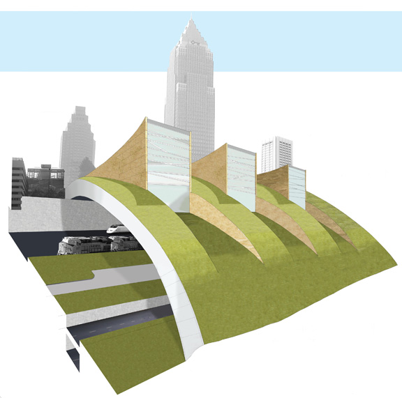 In 1903, Daniel Burnham designed a master plan for the city of Cleveland which included a wide pedestrian mall, culminating with a train station on shore of Lake Erie. However, the station was never built the and the city was left with a series of rail lines that cut off the downtown from the lakefront. In 2009, the Cleveland Urban Design Collaborative held a design competition for a transportation center that would complete the city-lake connection. I designed a building which not only enclosed the train station below, but whose roof also acted as an extension of the pedestrian mall above.